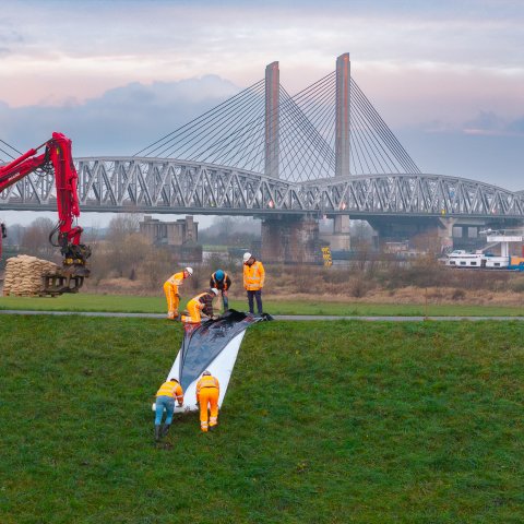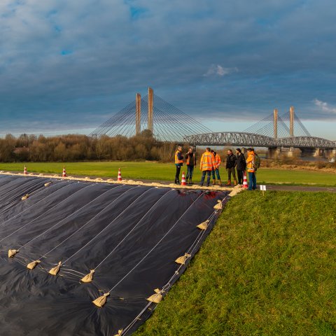Tijdens de oefening deden we alsof er een hoogwatergolf vanuit de Rijn en de Maas aankwam. In werkelijkheid oefenden de dijkwachten vooral met het afdekken van de dijk met zeil bij Zaltbommel. Dit is een belangrijke maatregel: het zeil beschermt de dijk bij hoogwater tegen golven, stroming en insijpelend water. Zo blijft de dijk stabieler.