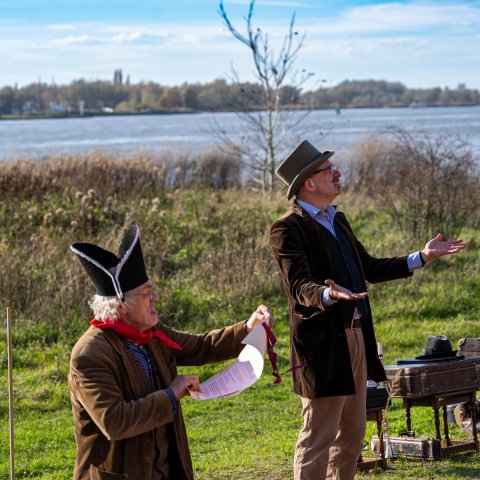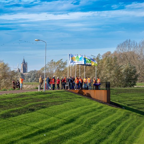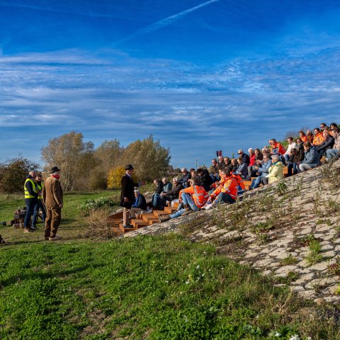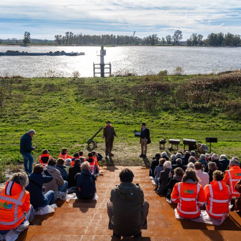De dijkversterking tussen Gorinchem en Waardenburg is bijna klaar. Op weg naar het echte ‘hoogwaterveiligmoment’ op 1 december was er aandacht voor bijzondere locaties langs de dijk. Op woensdagmiddag 12 november stonden we met bestuurders en bewoners op de Herculespost bij Dalem. Verhalenvertellers brachten het verleden tot leven met verhaal en muziek. En er was aandacht voor de maquette die laat zien hoe de verdediging in dit gebied vroeger verliep.