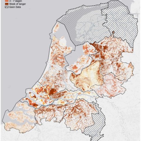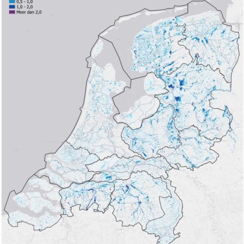 Bart Maas, onderzoeker Deltares: “Het landelijk waterbeeld geeft voor het eerst een samenhangend overzicht van de wateroverlast die kan ontstaan bij grootschalige extreme regen in en tussen verschillende typen gebieden. Zo zien we in laag Nederland uitgestrekte gebieden met overwegend ondiepe, langdurige wateroverlast tot enkele weken, terwijl in hoog Nederland vooral lokaal rondom beken grotere waterdieptes voorkomen. Dit waterbeeld is een eerste bijdrage om beter voorbereid te kunnen zijn op dit soort gebeurtenissen.”
