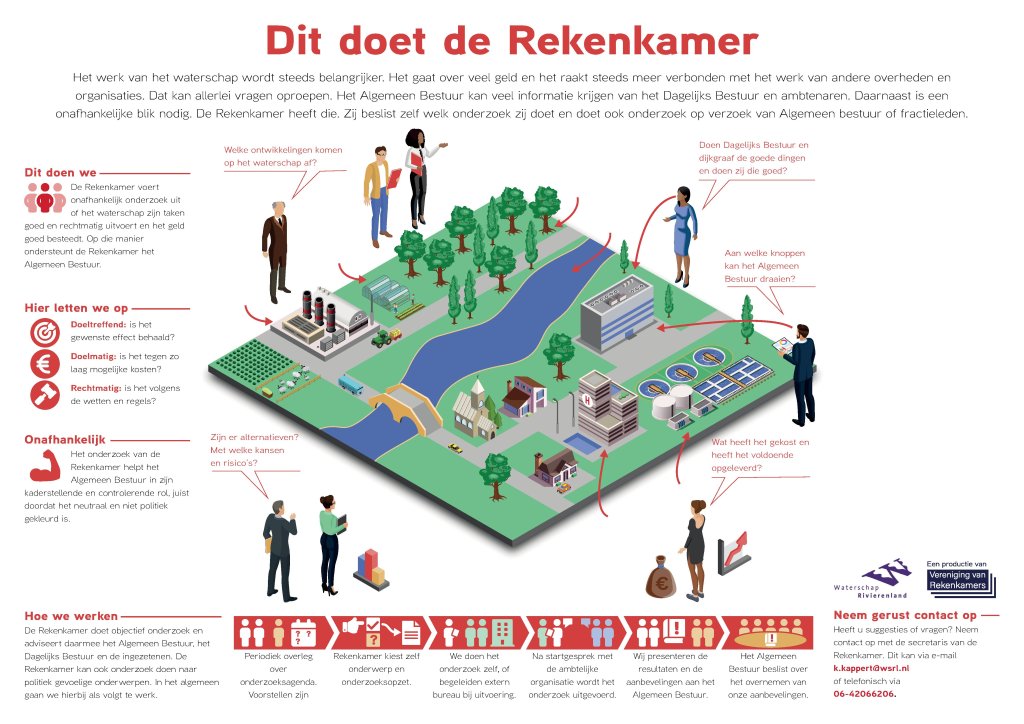 De Rekenkamer van het waterschap ondersteunt het Algemeen Bestuur van het waterschap in de uitvoering van zijn taken. De Rekenkamer wil bijdragen aan meer inzicht in de prestaties van het waterschap en als het nodig is aanbevelingen doen voor de toekomst.